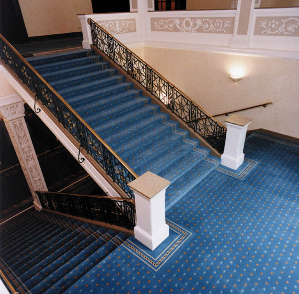 Eine besonders kniffelige Aufgabe war die Verlegung des Teppichbodens im Treppenhaus. Hier kam es auf die exakte Passgenauigkeit der Muster in einem 3-dimensionalem Verlauf der Treppe an. Hier ist absolutes Fachwissen gefragt, vom Designentwurf des Teppichbodens über den rapportgerechten Zuschnitt bis zum passgenauen Verlegen.