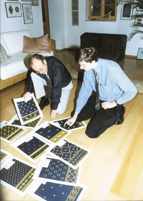 Nach dem wir die verschiedenen Elemente und Bordüren zu Themengruppen zusammengefasst haben wurde jedes einzele Muster in den Computer eingegeben und in den richtigen Farben coloriert, sodaß ein möglichst realitätsnaher Eindruck der verschiedenen Motive entstand.Nun begann die Qual der Wahl, denn das Grundmotiv bestimmt den Gesamteindruck des Hauses und ist somit von ganz Elementarer Bedeutung.