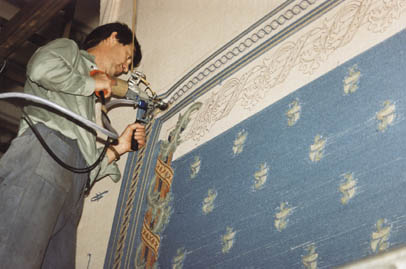 Danach beginnt der eigentliche Prozeß der Herstellung. Mit einer Druckluftpistole wird der Flor dem Muster folgend in das Grundgewebe eingebracht. Der große Unterschied zum Handknüpfen ist, das der Tufter nicht Reihe für Reihe herstellt, sondern mit der Tuftpistole dem Musterverlauf folgt. Somit können gerade geschwungene Formen wie unser Muster besonders gut ausgearbeitet werden.