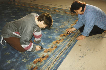 Nach dem Tuftverfahren wird er Flor im Grundgewebe eingebunden und dann kaschiert. Damit das Muster von der Vorderseite möglichst sauber und plastisch zu sehen ist werden die Konturen mit speziellen Scheren nachgeschnitten. Dies ist ein besonders difisiller Arbeitsgang, denn jeder Fehlschnitt ist sichbar und irreparabel.