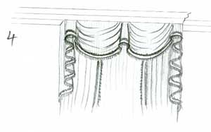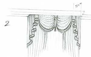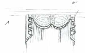 Bei den Gardinen war klar, daß eine klassiche Grundform die Dekoration bestimmen muß. Wir Skizzierten hier 4 Entwürfe, die wir der BASF zur Auswahl vorlegten. Dabei war klar, daß die Proportion des Fensters eine zweigeteilte Wolke ergeben mußte. Wir variierten hier die Entwürfe sowohl bei der Raffung der Wolke als auch bei der Form der Scherpen. Man entschied sich den für die 1. Variante
