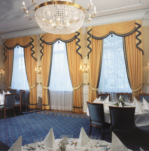 Besonderen Ausdruck bekommen die Übergardinen erst durch die kontrastierenden Besätze. Hier wurde das Blau der Teppiche gewählt, das besonders gut zum gelb den Stoffe passt. In einem anderen Saal wurde die Gardine genau anders herum (gelber Besatz auf blauem Grund) gestaltet.